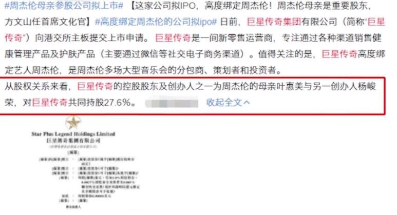 最近,被称为“周杰伦概念股”的巨星传奇即将在香港上市,背后的团队几乎被周杰伦的亲朋好友接管,她的母亲叶惠美是股东,她的朋友方文山是高管。从股权关系来看,巨星传奇的控股股东及创始人之一周杰伦的母亲叶惠美,与另一位创始人杨峻荣共同持有巨星传奇27.6%的股份.